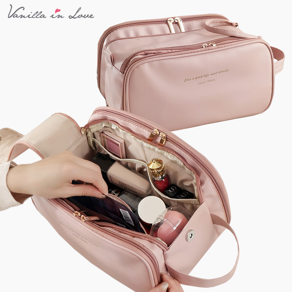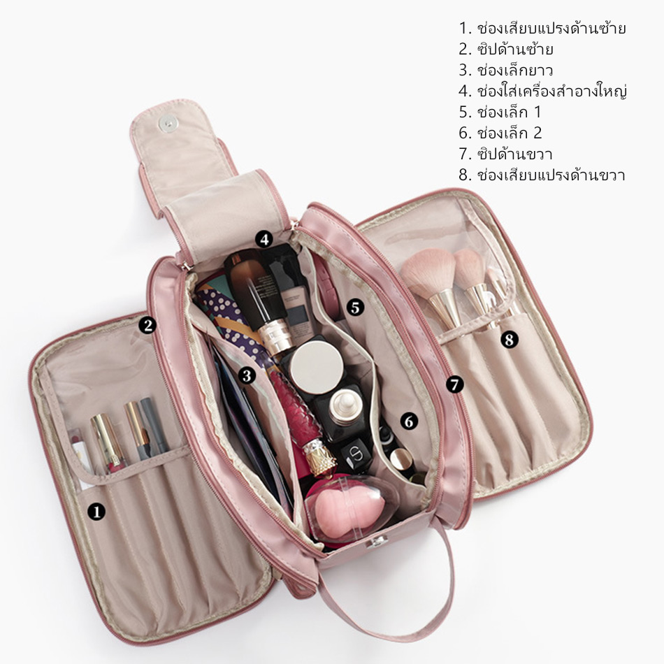 กระเป๋าเครื่องสำอางแบบซิปขนาดใหญ่ ช่องเยอะ พร้อมหูหิ้วด้านบน