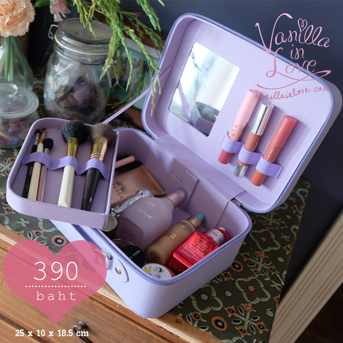 ภายในมีถาดจัดแยกเครื่องสำอาง บุหนังเทียมเช็ดทำความสะอาดง่าย มีกระจก ช่องเสียบลิป พร้อมหูจับด้านบน