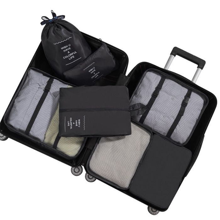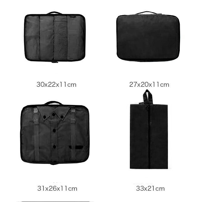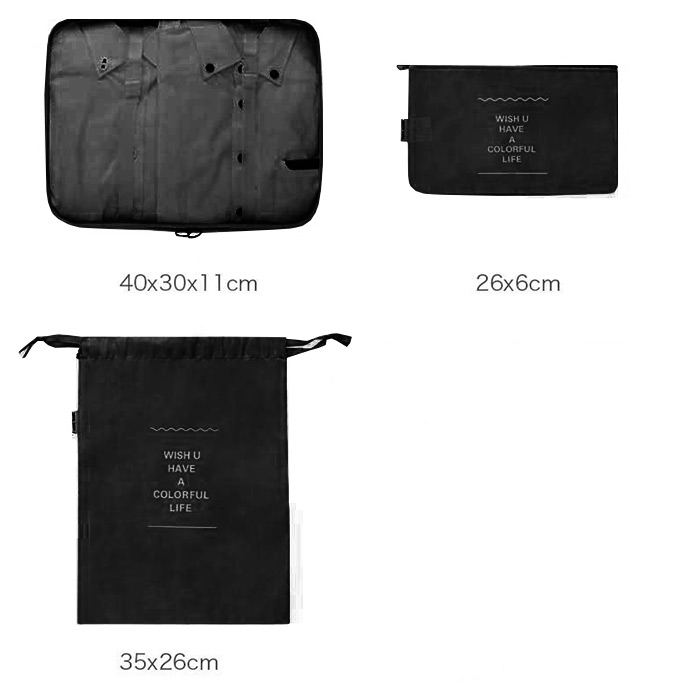 BG159 Travel set 7 ชิ้น ชุดจัดระเบียบกระเป๋าเดินทาง ถุงจัดระเบียบ สีดำเรียบหรู ใช้ได้ทั้งผู้หญิง ผู้ชาย กระเป๋าผ้า 7 ชิ้น สำหรับจัดเก็บเสื้อผ้า เครื่องสำอาง ชุดชั้นใน รองเท้า ในกระเป๋าเดินทาง แยกกันเป็นสัดส่วนหยิบใช้งานสะดวก สำหรับเตรียมตัวเดินทางต่างจังหวัด ต่างประเทศ ซักทำความสะอาดง่ายด้วยเครื่องซักผ้า