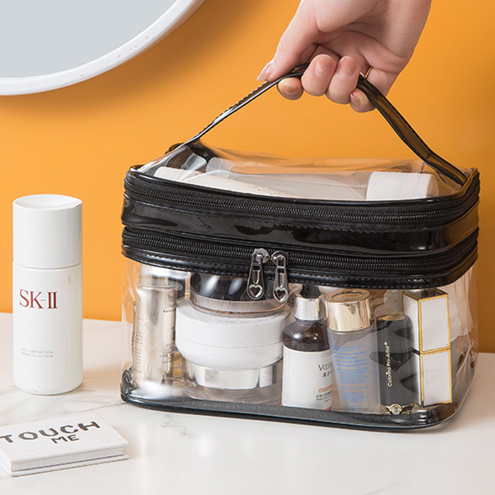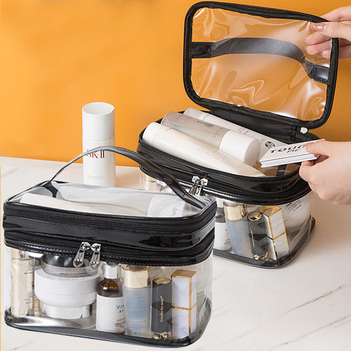 กระเป๋าเครื่องสำอาง แบบซิป 2 ชั้น สีดำมัน ขนาดใหญ่ จุของได้เยอะ ด้านบนใส เหมาะสำหรับพกพา ใส่กระเป๋าเดินทาง ขนาดกระเป๋าโดยรวม 24 x 15 x 15 cm