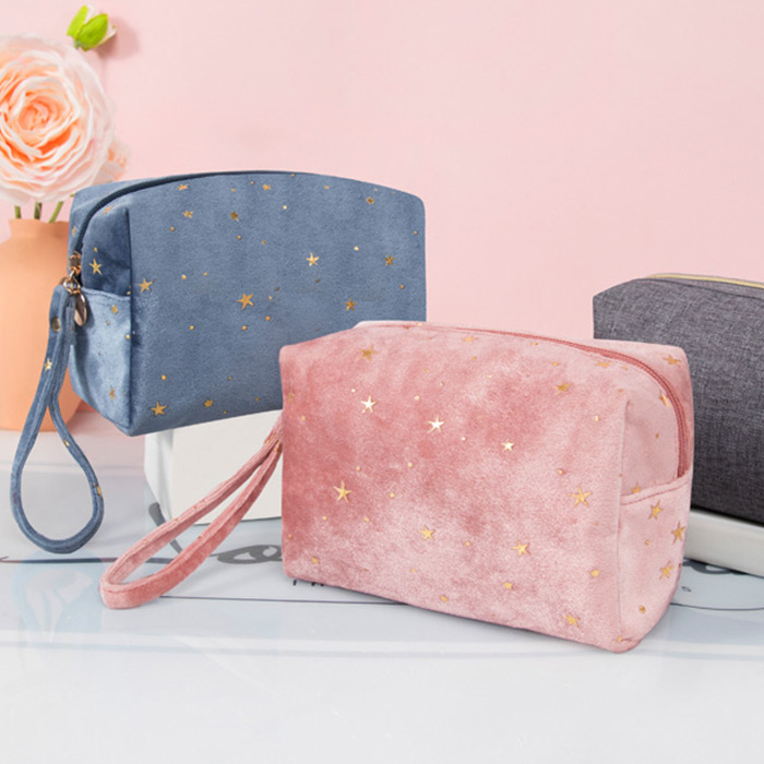 กระเป๋าเครื่องสำอางขนาดเล็กแบบซิป ทำจากผ้ากำมะหยี่กันน้ำ มีสองสีสีฟ้ากับสีชมพู เหมาะสำหรับใส่ในกระเป๋าสะพาย กระเป๋าเดินทาง