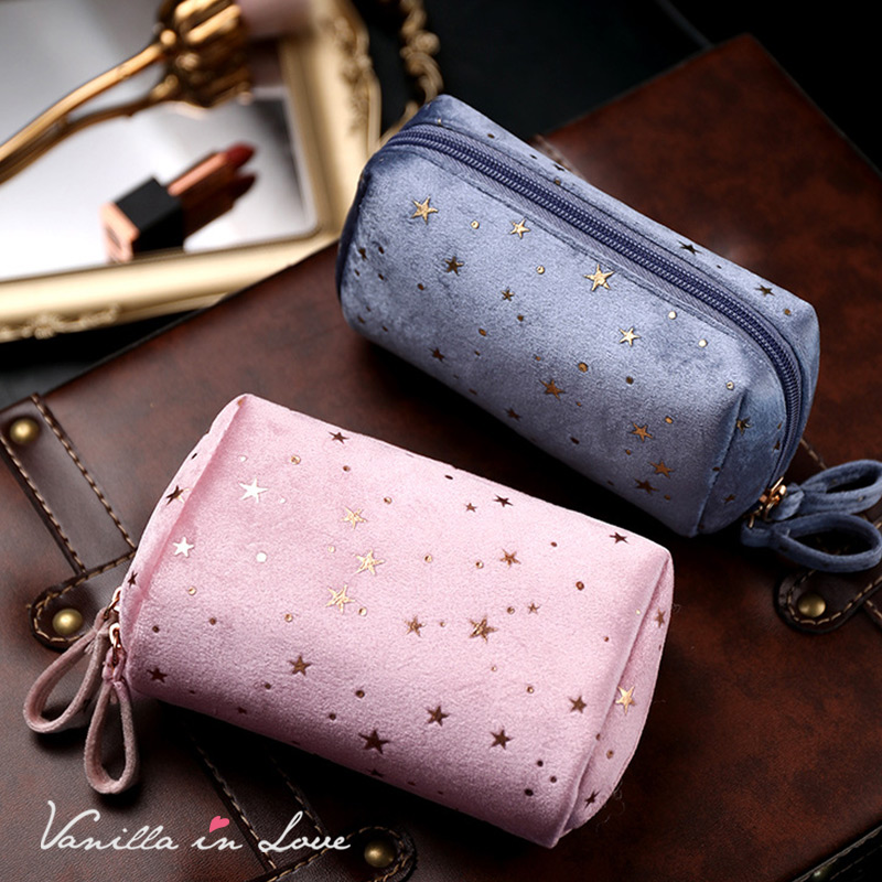 กระเป๋าเครื่องสำอางขนาดเล็กแบบซิป ทำจากผ้ากำมะหยี่กันน้ำ มีสองสีสีฟ้ากับสีชมพู เหมาะสำหรับใส่ในกระเป๋าสะพาย กระเป๋าเดินทาง