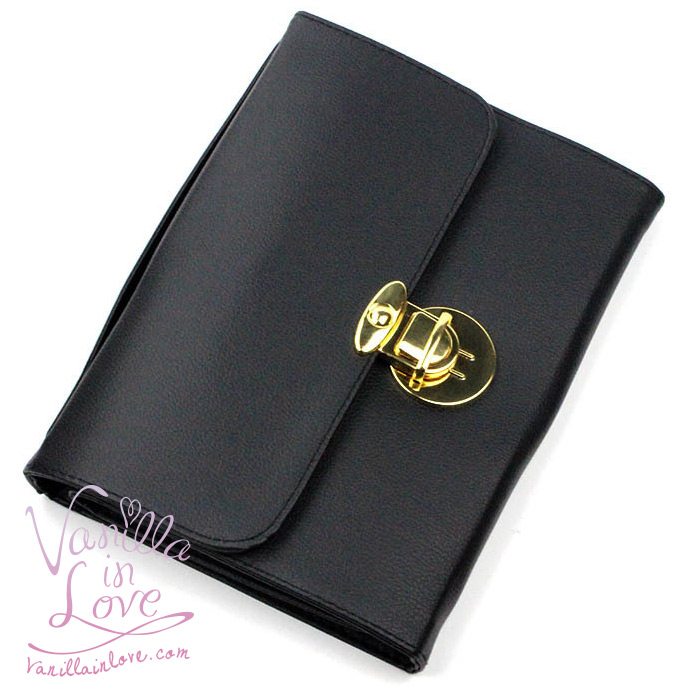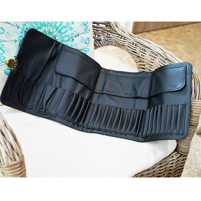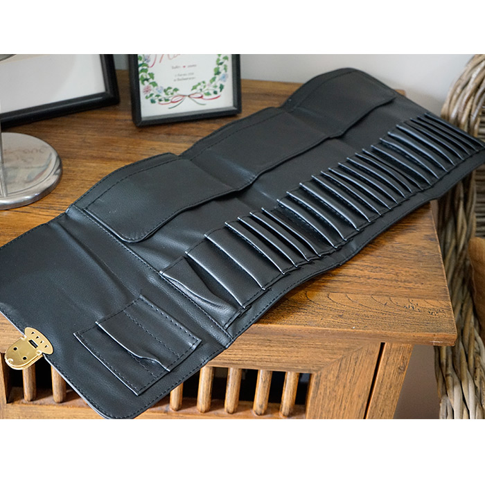 BR02 Brush Roll กระเป๋าแปรงแต่งหน้า ใส่ได้ 26 ชิ้น กระเป๋าแปรงหนัง PU สีดำ เช็ดทำความสะอาดง่าย มีอะไหล่สีทองสำหรับล็อคด้านหน้า มีช่องสำหรับเสียบแปรงแต่ละด้าม