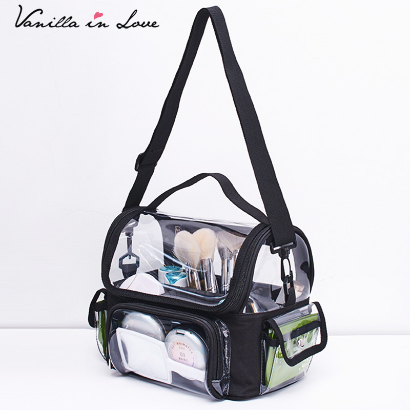 กระเป๋าผ้าไนล่อนสีดำและPVCใส พร้อมช่องแบ่งด้านใน ช่องแบ่งสามารถถอดออกได้จัดระเบียบภายในกระเป๋าได้ มีหูจับด้านบนและสายสะพาย