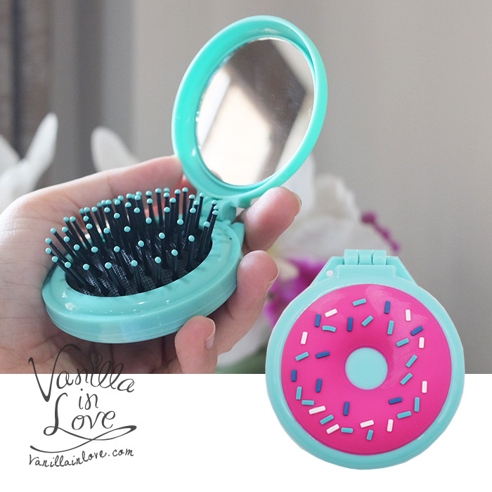 หวีพับทรงวงกลม สีฟ้าลายโดนัท ตกแต่งดอกไม้น่ารัก พร้อมกระจกในตัว ขนาดพกพา พอๆ กับตลับแป้ง พกพาในกระเป๋าสะพายเล็กได้สบาย ขนาด 6.5*7 cm