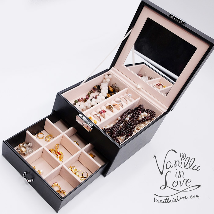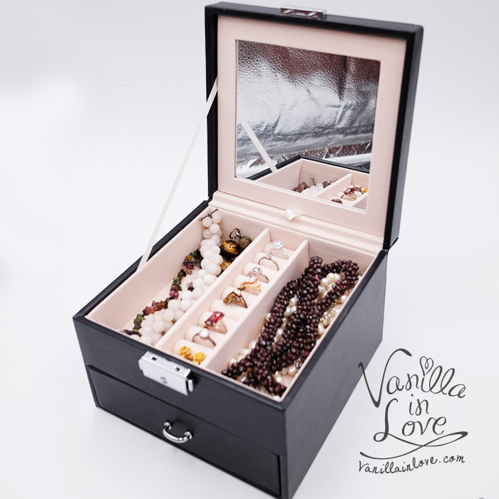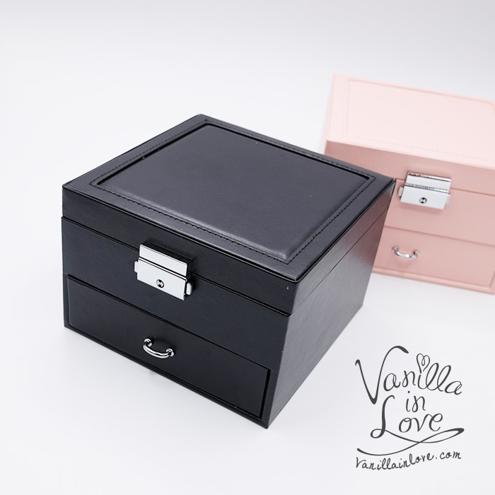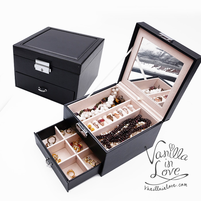 ขนาด 16* 16*12 cm กล่องสำหรับใส่เครื่องประดับ Jewelry Jewely Box แหวน สร้อยคอ นาฬิกา ตุ้มหู จึ้ พร้อมกระจกในตัวกล่องเครื่องประดับ แข็งแรงทนทาน แบ่งออกเป็นชั้นบนเปิดออกและลิ้นชักด้านล่างสำหรับแยกเครื่องประดับออกเป็นสัดส่วนไม่ปนกัน ทำจากหนังเทียมสีดำ งานเรียบหรูหรากล่องเครื่องประดับ มีหูหิ้วพร้อมกุญแจ สำหรับพกพาไปไหนได้